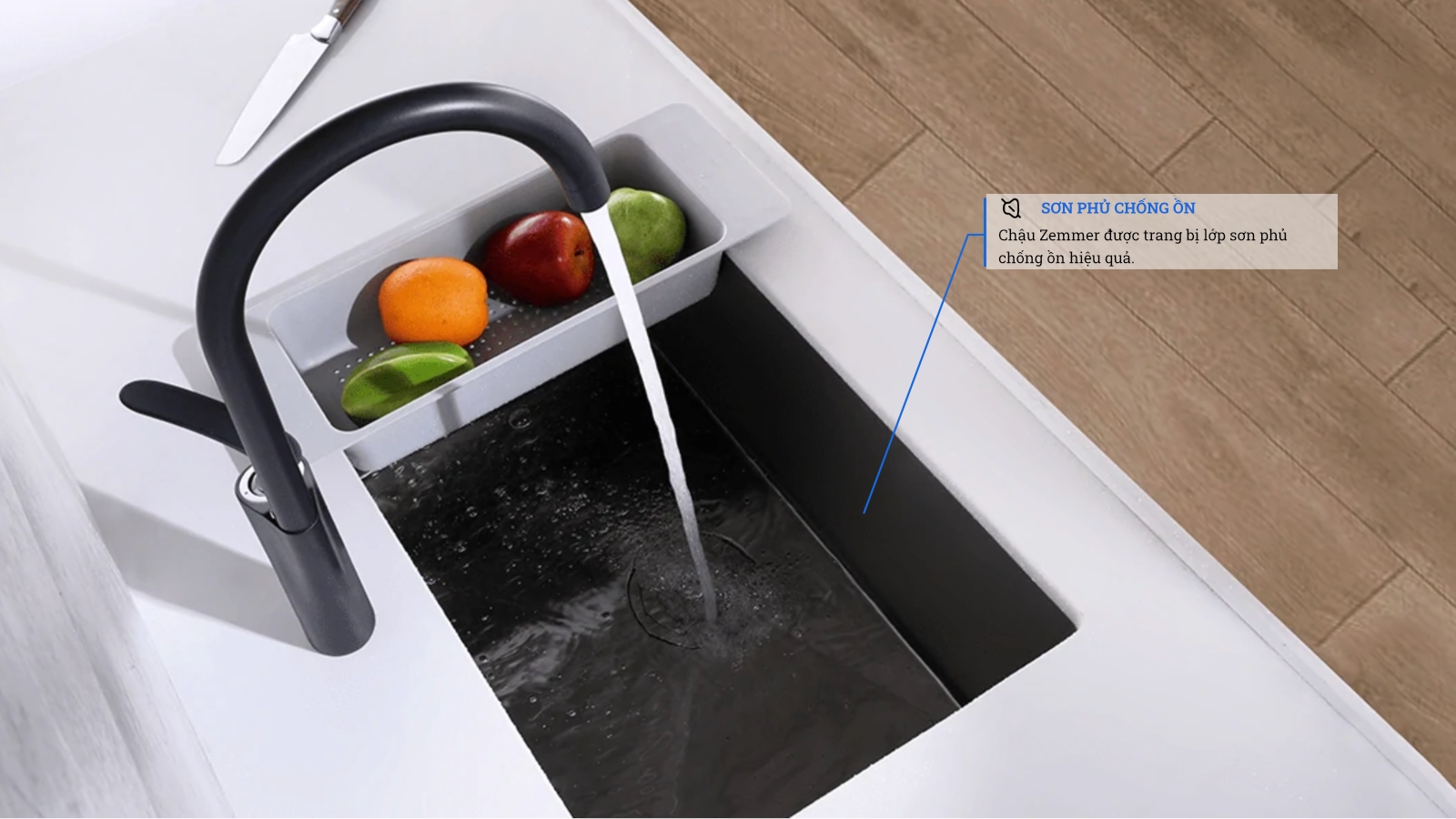 - Chậu rửa được trang bị lớp xốp 4 chiều & được sơn phủ chống ồn toàn bộ phía ngoài làm giảm tối đa tiếng ồn khi xả nước