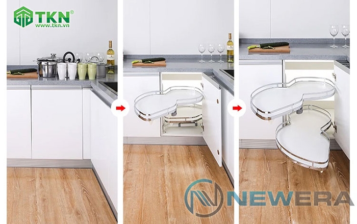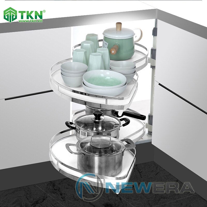 -Kệ góc xoay liên hoàn NewEra dùng cho tủ góc được sản xuất trên dây chuyền hiện đại, được đánh giá là phụ kiện tuyệt vời, giúp tối ưu không gian phòng bếp